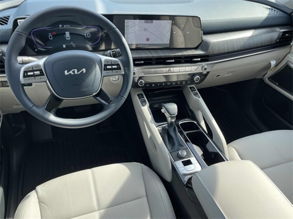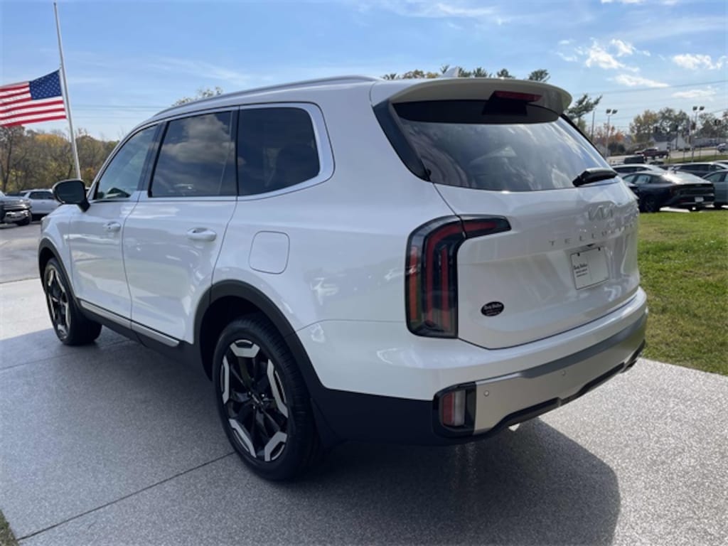 Check out all these great options EX Captain's Chair Package, 3rd row seats: split-bench, 4-Wheel Disc Brakes, 6 Speakers, ABS brakes, Air Conditioning, All Weather Floor Mats, Alloy wheels, AM/FM radio: SiriusXM, Apple CarPlay & Android Auto, Auto High-beam Headlights, Auto-dimming Rear-View mirror, Automatic temperature control, Brake assist, Bumpers: body-color, Compass, Delay-off headlights, Driver door bin, Driver vanity mirror, Dual front impact airbags, Dual front side impact airbags, Electronic Stability Control, Emergency communication system: 911 Connect, Exterior Parking Camera Rear, Four wheel independent suspension, Front anti-roll bar, Front Bucket Seats, Front Center Armrest, Front dual zone A/C, Front reading lights, Fully automatic headlights, Heated & Ventilated Front Bucket Seats, Heated door mirrors, Heated front seats, Illuminated entry, Knee airbag, Leather Seat Trim, Leather Shift Knob, Leather steering wheel, Low tire pressure warning, Navigation System, Occupant sensing airbag, Outside temperature display, Overhead airbag, Overhead console, Panic alarm, Passenger door bin, Passenger vanity mirror, Power door mirrors, Power driver seat, Power Liftgate, Power moonroof, Power passenger seat, Power steering, Power windows, Radio data system, Radio: AM/FM Display Audio System, Rear air conditioning, Rear anti-roll bar, Rear audio controls, Rear reading lights, Rear seat center armrest, Rear side impact airbag, Rear window defroster, Rear window wiper, Reclining 3rd row seat, Remote keyless entry, Security system, Speed control, Speed-sensing steering, Split folding rear seat, Spoiler, Steering wheel mounted audio controls, Tachometer, Telescoping steering wheel, Tilt steering wheel, Traction control, Trip computer, Turn signal indicator mirrors, Variably intermittent wipers, Ventilated front seats, and Wheels: 20" x 7.5" Black Finish. Glacial White Pearl 2025 Kia Telluride EX FWD 8-Speed Automatic 3.8L V6 DOHC