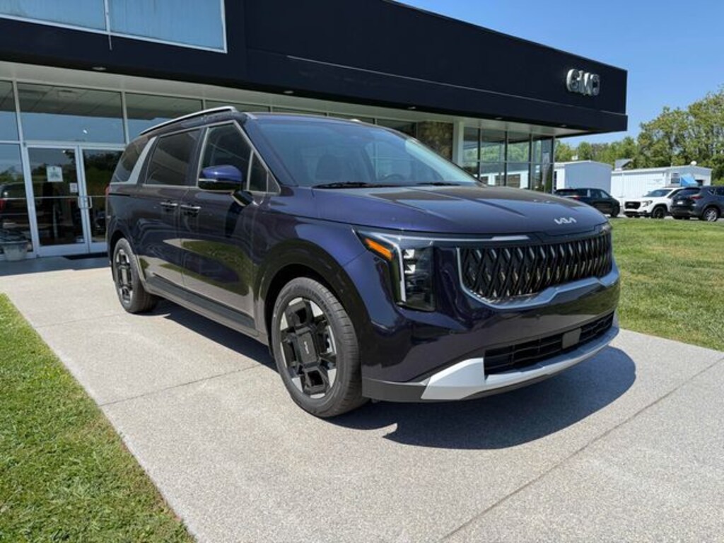 Check out all these great options 3.51 Axle Ratio, 3rd row seats: split-bench, 4-Wheel Disc Brakes, 8 Speakers, ABS brakes, Air Conditioning, Alloy wheels, AM/FM radio: SiriusXM, Apple CarPlay & Android Auto, Artificial Leather Seat Trim, Auto High-beam Headlights, Auto-Dimming Mirror with HomeLink, Automatic temperature control, Brake assist, Bumpers: body-color, Cargo Mat, Carpeted Floor Mats (8-Passenger), Compass, Delay-off headlights, Driver door bin, Driver vanity mirror, Dual front impact airbags, Dual front side impact airbags, Electronic Stability Control, Emergency communication system, Exterior Parking Camera Rear, Four wheel independent suspension, Front anti-roll bar, Front Bucket Seats, Front Center Armrest, Front dual zone A/C, Front reading lights, Fully automatic headlights, Heated door mirrors, Heated Front Bucket Seats, Heated front seats, Illuminated entry, Knee airbag, Leather Shift Knob, Leather steering wheel, Low tire pressure warning, Memory seat, Navigation System, Occupant sensing airbag, Outside temperature display, Overhead airbag, Overhead console, Panic alarm, Passenger door bin, Passenger vanity mirror, Power door mirrors, Power driver seat, Power Liftgate, Power passenger seat, Power steering, Power windows, Radio: AM/FM/HD Audio System, Rear air conditioning, Rear reading lights, Rear window defroster, Rear window wiper, Reclining 3rd row seat, Remote keyless entry, Security system, Speed control, Speed-sensing steering, Split folding rear seat, Spoiler, Steering wheel mounted audio controls, Tachometer, Telescoping steering wheel, Tilt steering wheel, Traction control, Trip computer, Turn signal indicator mirrors, Variably intermittent wipers, and Wheels: 7.5J x 19" Machine-Finished Alloy. Deep Chroma Blue 2026 Kia Carnival EX FWD 8-Speed Automatic V6